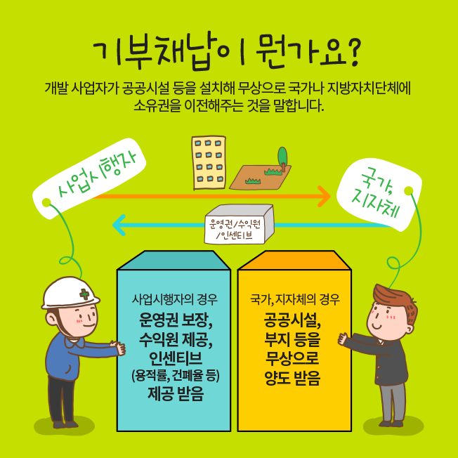 기부채납은 개발자가 자신의 소유 재산을 국가나 지방자치단체에 기부하는 것을 의미합니다. 이는 주로 공공 시설의 설치와 관련이 있으며, 개발자는 법적 의무에 따라 특정 조건을 충족해야 합니다. 기부채납은 도시 개발 과정에서 필수적으로 요구되는 경우가 많습니다. 예를 들어, 아파트 단지를 개발할 때, 해당 지역에 필요한 도로, 공원 등의 공공 시설을 설치하고 이를 정부에 기부하는 방식입니다. 이러한 기부는 개발자가 지역 사회에 기여하는 방법 중 하나로 여겨집니다.